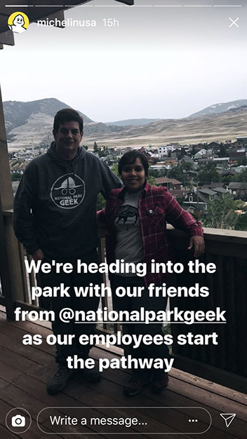 In September of 2017, I was approached by Michelin USA to tell the story of their partnership with Yellowstone National Park and the non-profit Yellowstone Forever. They have been working with them for 10 years on sustainable issues and building new pathways from recycled tires in the Old Faithful area. I was brought out to Yellowstone to tell this story on my social media channels. As a social influencer, the combined posts had over +801K impressions to help share the word of this awesome partnership between an international corporation and the park.